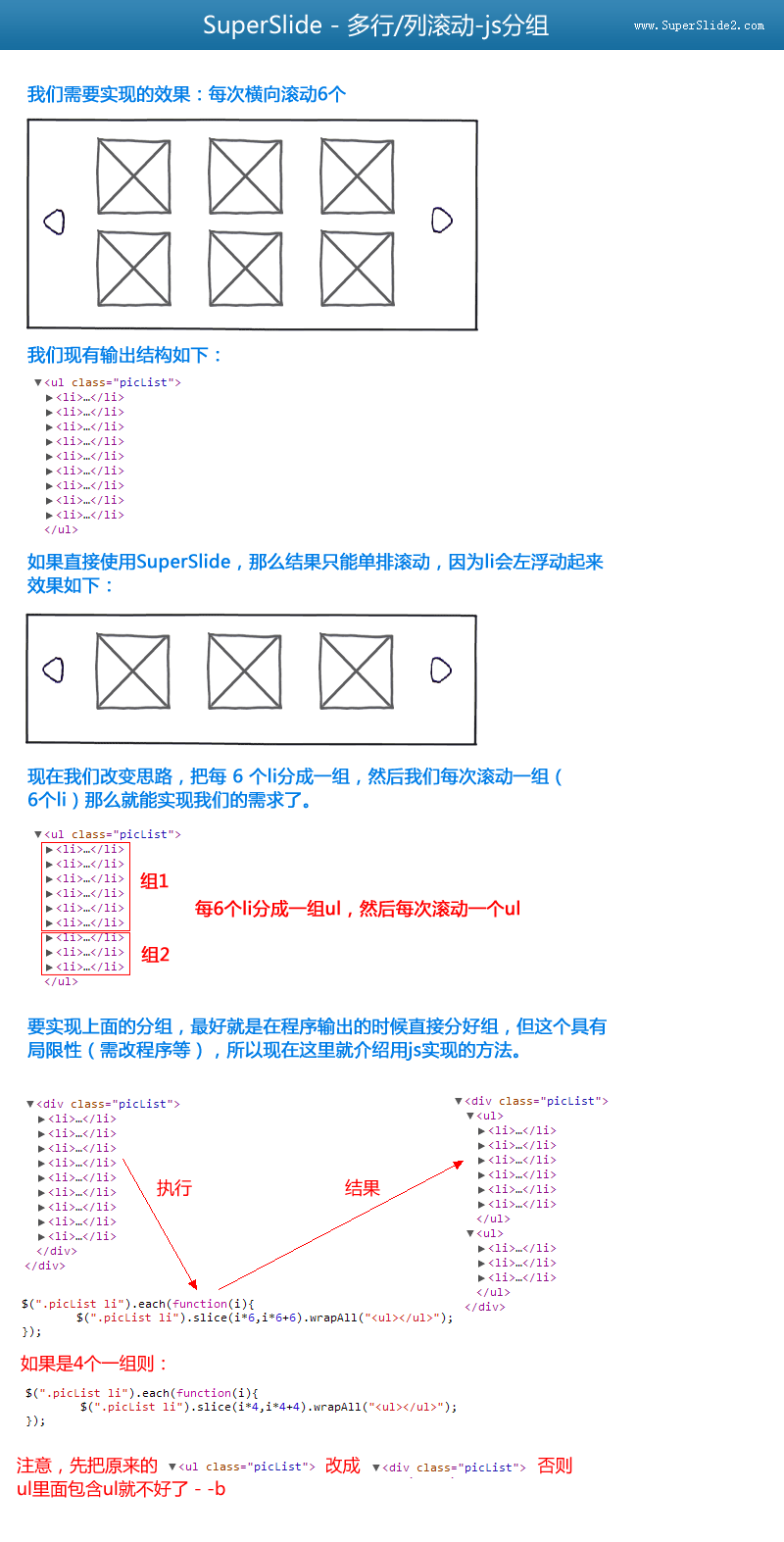 /* 使用js分组,每6个li放到一个ul里面 */ jQuery("#multipleColumn .bd li").each(function(i){ jQuery("#multipleColumn .bd li").slice(i*6,i*6+6).wrapAll(" 3、相信这个能解决麻烦的分组问题